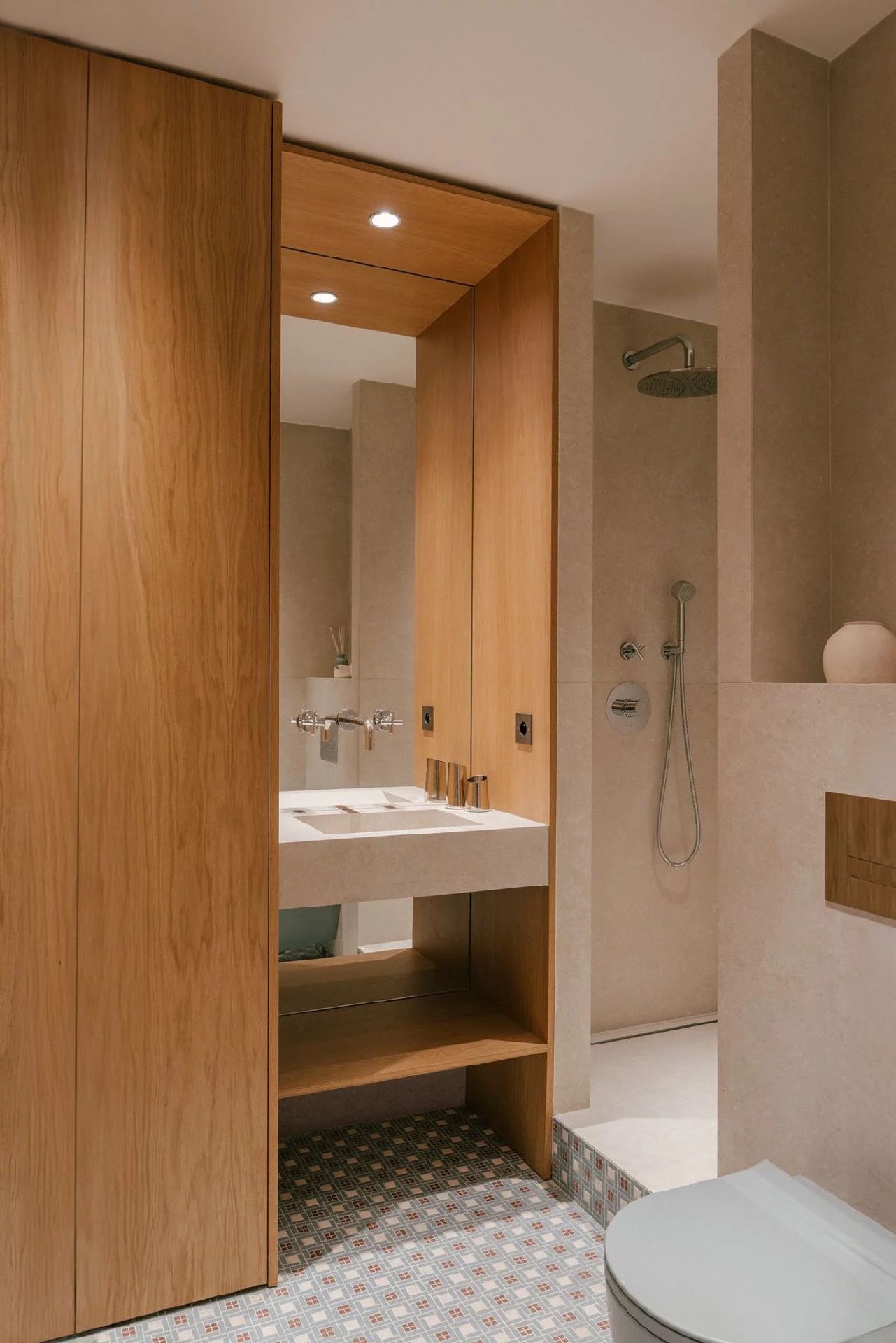Rangements intégrés, lignes épurées, parquet neuf, placards en chêne et céramique claire : des matériaux soigneusement sélectionnés pour un rendu contemporain et chaleureux.